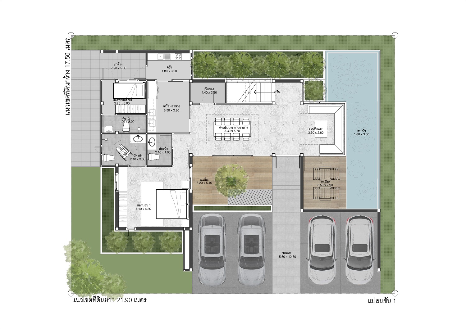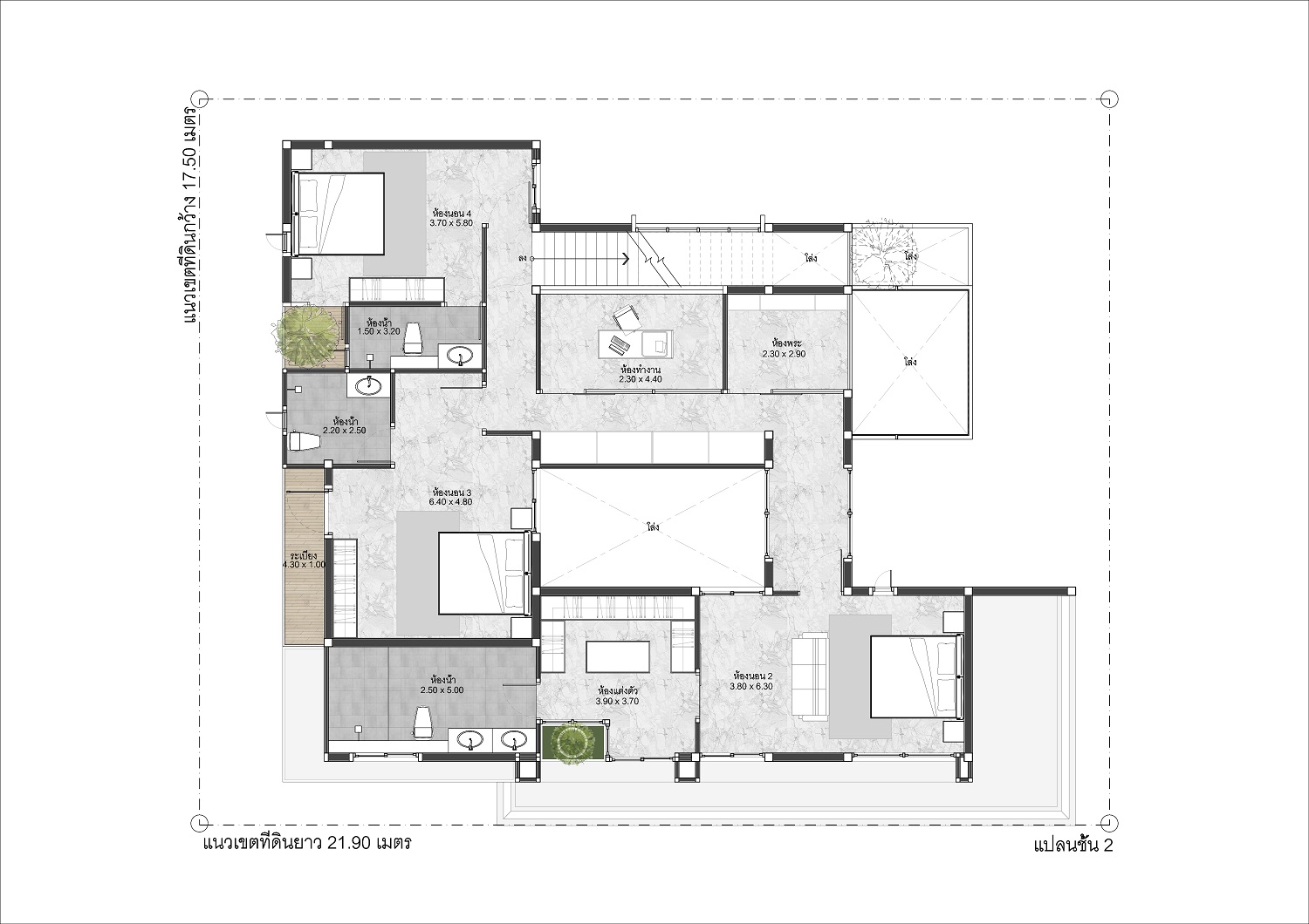 บ้าน 2 ชั้น สีขาวตัดเทา สไตล์โมเดิร์น ด้วยการออกแบบให้ทางเข้าบ้านเชื่อมต่อกับคอร์ดกลางบ้านที่เปิดโล่งถึงชั้น 2 สามารถทำเป็นมุมพักผ่อน หรือมุมรับแขกได้อีกด้วย ภายในตัวบ้านเน้นการออกแบบให้เป็นพื้นที่เชื่อมต่อ เพื่อให้บ้านโล่งและโปร่งไม่มีเสากั้น นอกจากนี้ยังจัดฟังก์ชั่นของแต่ละห้องได้อย่างลงตัว..